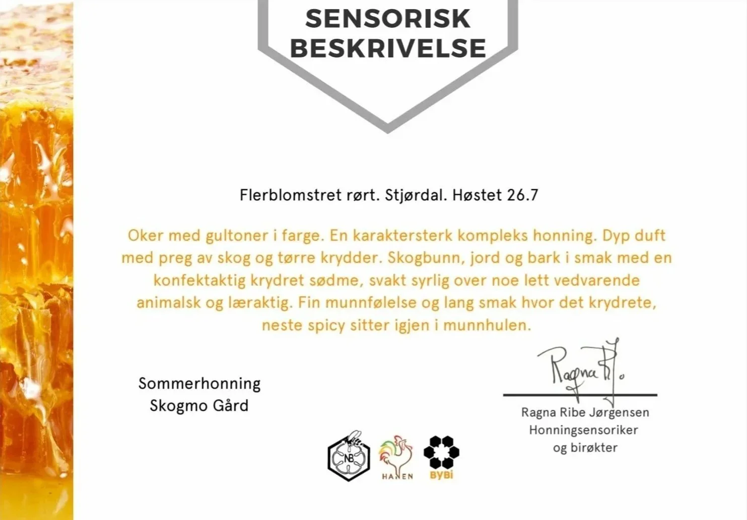 Ingen honninger er helt like, litt på samme måte som vin. Som ferske i gamet ønsket vi i forbindelse med NM å få en sensorisk beskrivelse av honningen vår, slik at en ekspert kunne sette ord på smak, aroma og uttrykk. Denne beskrivelsen har vi akkurat mottatt – og den var mildt sagt imponerende.